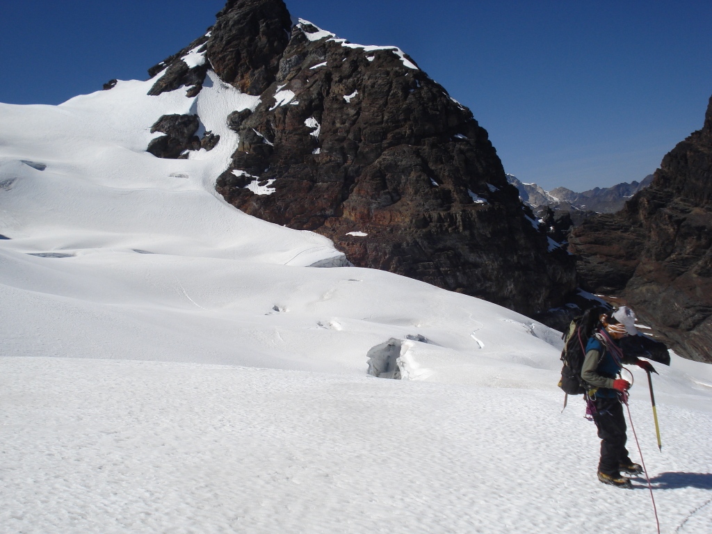 por un glaciar que es común con la subida al Tarija y Pequeño Alpamayo, A unos