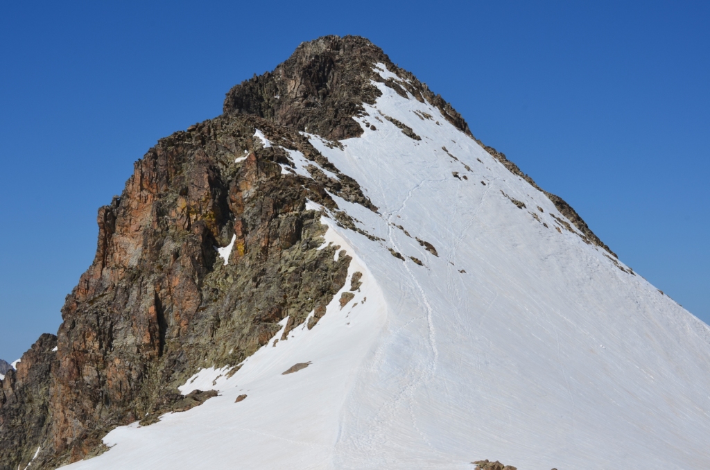 Pero el plato fuerte en esta zona son El Garmo Negro, algo más distanciado desde la zona del Lago, y los picos de Los infiernos. Para hacer este último pico, vivaqueamos en los Ibones Azules (aun no había abierto el refugio, le quedaba apenas una semana) y con este campo base instalado, pudimos disfrutar de las ascensiones sin prisa alguna. Hacerlo desde el Balneario en un día, es una paliza de muchas horas. Nosotros decidimos disfrutarlo quedándonos 3 días en las alturas.