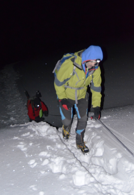 entre las línea de seracs y pilares de roca para seguir finalmente