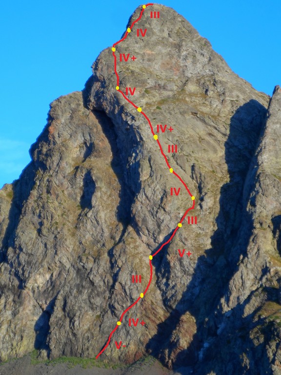 La escalada presenta 10-12 largos según se enlacen alguno de ellos. Toda la vía está equipada y bien protegida con parabolts, por lo que sobre todo, hay que prestar atención a los bloquees y piedras sueltas. En general toda la vía es de III y IV grado, destacando una corta zona de bloques (IV+/V) antes de acceder a la cresta que dirige a la cumbre (largo 8-9). Y sobre todo destaca la placa tumbada del largo 3 que discurre junto a una grieta paralela, donde la roca más lisa no ofrece muchas presas. Esta zona conocida como “triedro” está bastante lisa, los seguros van paralelos a la grieta donde podemos encajar el puño y tirar de alguno de sus resaltes, pero apenas hay más presas buenas ya que la roca solo dispone de regletas en sentido contrario a nuestro avance. Más a la derecha hay más presas, pero están alejadas de los seguros así que con un poco de tacto se van pasando los 15-20 metros de esta zona que le da el grado a la vía (V+).