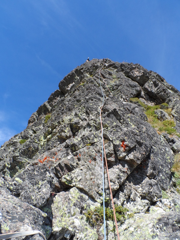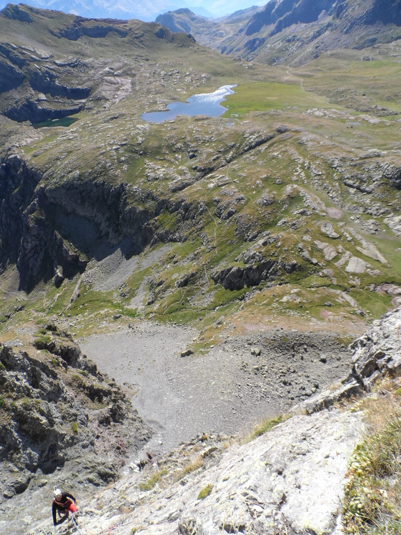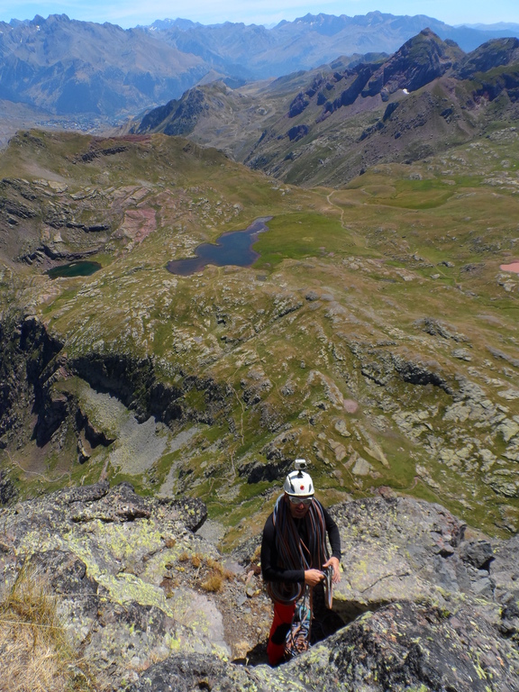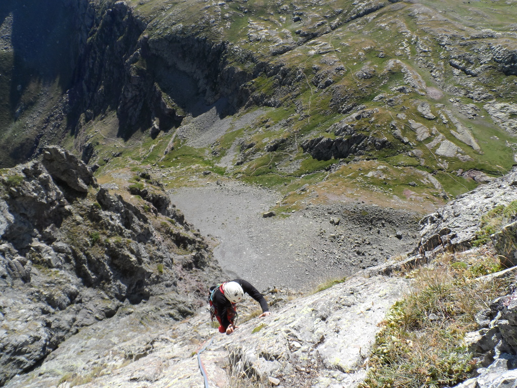 Por lo demás, tras el triedro, es donde más se disfruta en placas tumbadas con multitud de regletas y buenas presas y con un nada despreciable patio a tus espaldas. Como seguir la vía es fácil (sólo tenemos que ir buscando la siguiente chapa) podemos disfrutar de la escalada en todo momento. Las reuniones están equipadas con 2 parabolts y la última de ellas nos deja directamente a escasos 10 metros de la cumbre. Tanto en la escalda como en la bajada por la normal hay que prestar atención y procurar no tirar piedras a otros escaladores. Buen tiempo, escalda disfrutona, día perfecto. Para volver, la bajada la realizamos por La Garganta para retomar Espelunciecha por La Glera de Anayet, haciendo así un vuelta circular. Aunque el paisaje en esta zona quede penalizado, más si cabe, por los remontes y pistas de la estación de esquí, vamos contemplando en todo momento El Balaitus y Los Infiernos como telón de fondo en el horizonte.