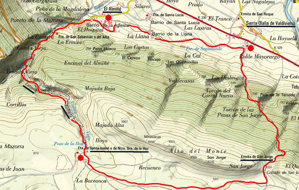 Esta ruta es muy entretenida, ya que discurre por varios escenarios, siendo el más original una de las calzadas romanas mejor conservadas, y que discurre encañonada y paralela al puerto de La Mazorra, para enlazar el pueblo de El Almiñé y la Ermita de la Hoz. La calzada está en buen estado y escondida en la denominada Cuesta Vieja. En lo alto, junto a la Ermita, podremos ver un pozo natural muy curioso y recuperado, el Pozo de la Hoz. La calzada corresponde a un tramo del GR-85