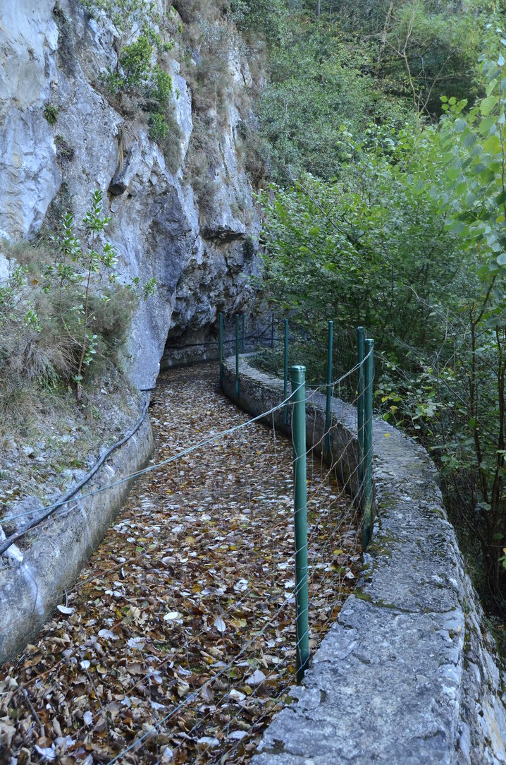 Las prohibiciones se centran en el propio muro del canal por el que se puede realizar la ruta en gran parte del recorrido. Por estos 40 cm. pondremos a prueba nuestro equilibrio para no caernos hacia dentro en el agua, o hacia fuera, ladera abajo. Este muro presenta una barandilla mediocre en el lado del valle aunque no en toda su longitud; y solo en la parte final, recién instalada, hay un tramo con una barandilla doble y en buenas condiciones. El primer túnel es transitable gracias a unas placas metálicas, y el resto se evitan siguiendo el sendero que baja y sube continuamente, buscando la única posibilidad de avance, lo que provoca acumular finalmente un desnivel nada despreciable de 1.250 metros, unos 450 m. más que por la ruta normal, y que en esta ocasión utilizaremos de bajada para volver a nuestro punto de origen.